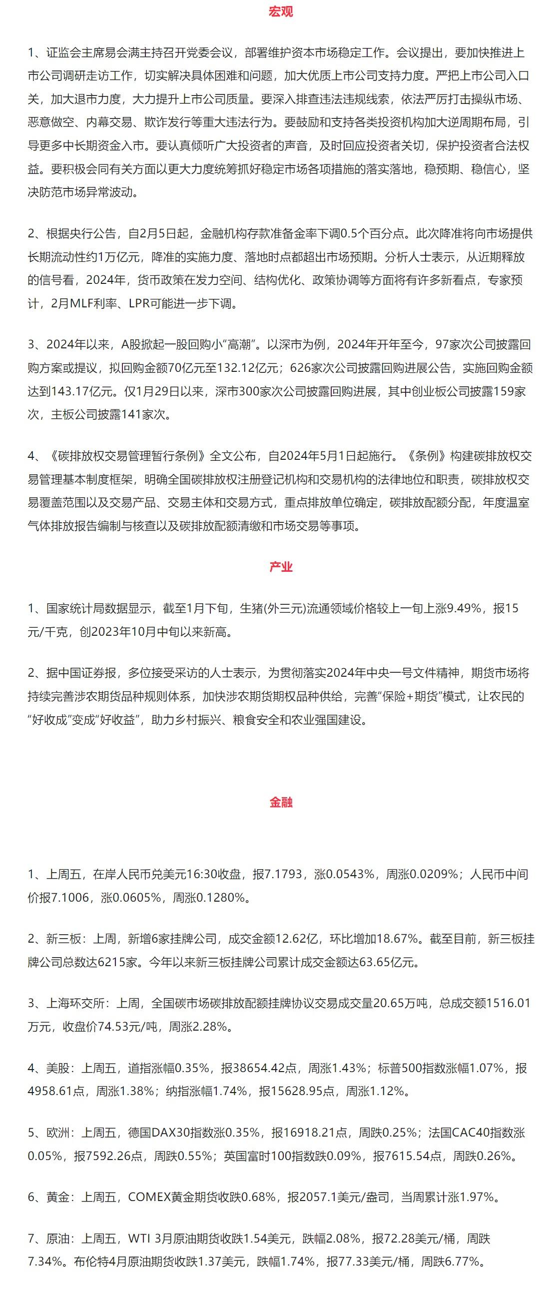 铝:本周降息预期继续回落,叠加库存开始累积,铝价走跌。截止2月2日收盘沪铝主力2403收于18810元/吨,周跌245元/吨,跌幅1.29%;伦铝收报2236.5美元/吨,周跌0.95%。供应持稳,不过市场传言云南或将在3月进行复产,需持续关注。下游临近春节企业陆续放假,铝材开工延续下滑,进入季节性累库周期支撑有所减弱。不过库存绝对值低位且铝水比例较高,市场对于累库预期目前较为乐观,节前万九附近震荡调整为主,前期多单逐步减仓,关注累库兑现情况和云南地区复产消息。