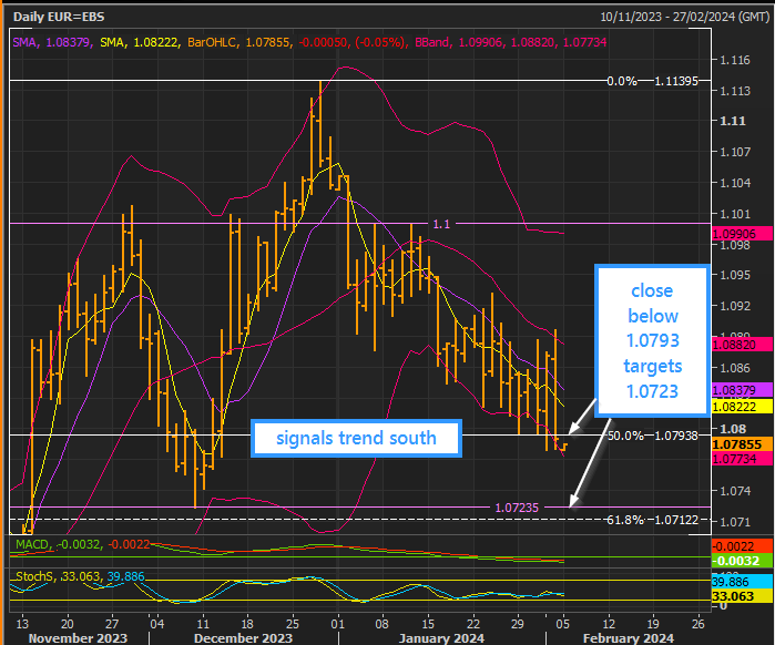 欧元主要支撑位1.0793已跌破,此处为10月/12月涨势的50%回档位,收盘价跌破1.0790后,下行目标将测试12月低点1.0723