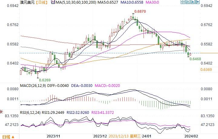 周一(2月5日),澳元/美元继上周五跌势继续收跌0.45%,收盘于0.6482。上周五非农以及隔夜制造业数据表现强劲,令短期内全球降息前景黯淡,刺激美债收益率持续回升,并带领美元全线走强,澳元则追随一干非美货币出现持续的下跌走势。澳洲央行本周二将宣布今年首次政策决定。分析师普遍预计澳洲央行将维持利率在4.35%不变,但关注焦点将是澳洲央行是否会保持其紧缩倾向。澳洲央行总裁布洛克将在会后记者会上,详细阐述政策决定的原因。澳洲央行总裁在新闻发布会上回答问题的语气,将是决定市场对澳洲央行预期的关键。日线图上,5、10和21日移动均线下跌,日线动能指标小跌,格局显示较强烈的下行倾向。澳元/美元初步阻力位在伦敦盘初高点0.6520及21日均线0.6592,初步支撑在纽约盘低点0.6469。