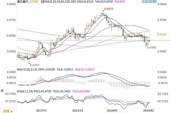 周二(2月6日),美元兑主要货币周二下跌,美元指数从周一触及的3个来月高点104.60下跌0.24%至104.19。美国克利夫兰联邦储备银行总裁梅斯特周二表示,如果美国经济表现符合她的预期,就可能开始降息,但在通胀仍不确定的情况下,她尚未准备好就放松政策的时机做出任何预测。其他央行决策者也持类似的观点。虽然各央行对于降息还是持等待的态度,但如果通胀表现若能回到目标之下,各央行将存在极大可能降息以报经济有着平稳发展的局面。梅斯特周二的讲话略使美元出现一点高位获利回落。而美国进入新年里所呈现的经济数据表现之强劲,令交易员们考虑不再是今年会出现软着陆还是衰退,而是美国今年经济会不着陆还是会重新加速。因此,对于美元当前走势的关键在于美联储政策决定与其他央行政策决定之间的对比,以及利率维持在多高水平。隔夜外汇市场上,日元兑美元小幅反弹,日内涨幅为0.20%报148.67。日本实际工资连续第21个月下降,但降幅有所放缓,而家庭支出则连续第10个月下降,这表明通胀超过了工资反弹的步伐,并继续拖累消费支出。如果日本央行仍然在利率上毫无加息的动向,那么日元维持弱势仍是大概率的事情。继续留意上方149这个水平的阻力力度,若突破日元将继续走弱。下方目前的强支撑落在了146附近。