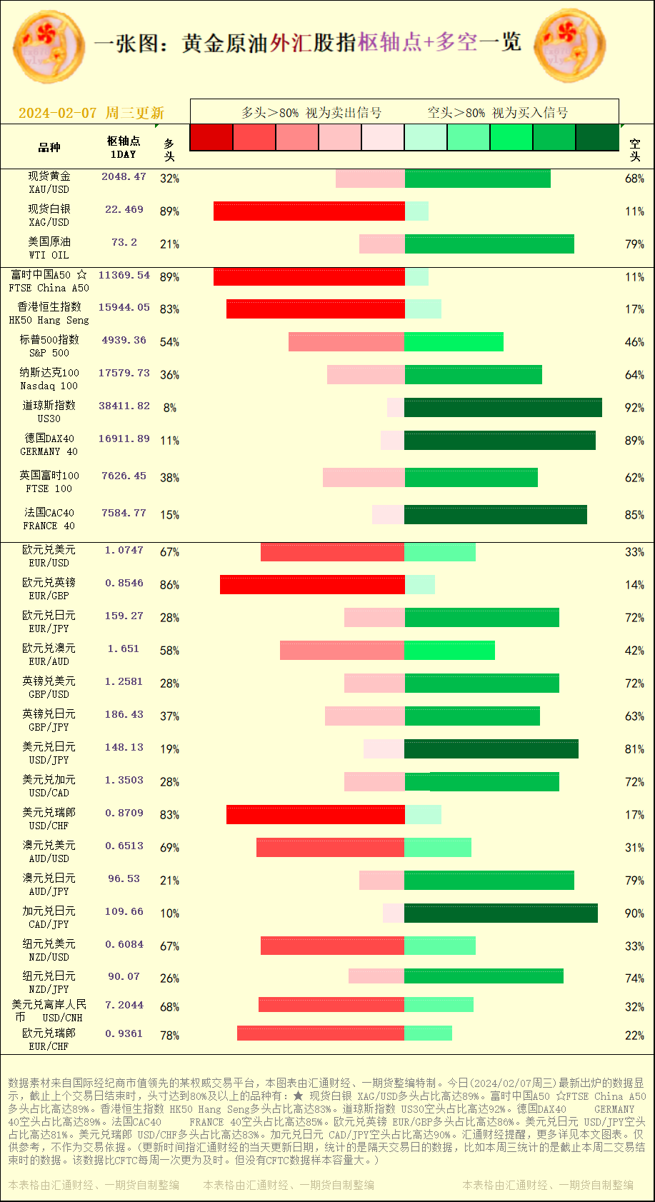 标题:一张图:2024/02/07黄金原油外汇股指"枢纽点+多空占比"一览