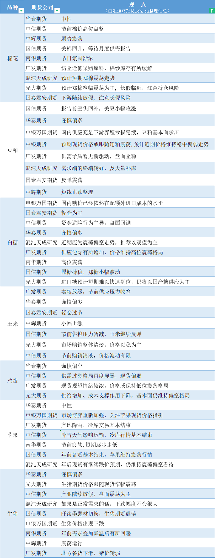 汇通财经APP讯——期货公司观点汇总一张图:2月7日农产品(棉花、豆粕、白糖、玉米、鸡蛋、生猪等)