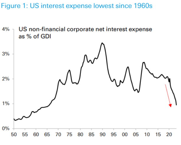 德意志银行外汇研究主管George Saravelos表示:“从企业部门开始,我们可以看到去年第三季度利息支出‘神奇地’持续下降,显着达到20世纪60年代初以来的最低水平。”