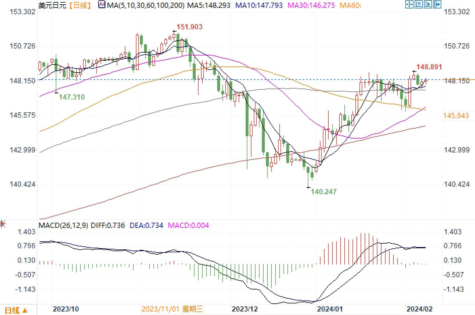 周三(2月7日),美元周三进一步略下跌0.11%至104.01,而美元兑日元则微涨0.13%至148.12。近期美国经济数据强于预期,推动美国公债收益率反弹。对债券收益率极为敏感的日元自然容易受到影响。即便美元近期出强势,且美元3月降息的可能性基本被排除,但鉴于对今年晚些时候降息的高度确信,市场仍不愿全力以赴做多美元。因此,我们也观察到,美元/日元在就业数据抬捧下的反弹力度似乎持续性不强,目前仍停留在前期的强阻力水平149之下。市场上目前还在等待美联储通胀数据的表现。如果通胀数据持续呈现回落,那么将进一步提升降息的可信度,从而可能削弱美元。若情况相反,则美元的强势将得以延续下去。日线图上,美元/日元汇价暂时仍停留在布林带通道中轨线略上方,但各项技术指标再度在超买区域呈钝化状,方向的指向性不太明朗。临近周末,在没有重大数据和消息的情况下,主防美元继续获利调整回落风险为主。上方继续关注149阻力强度,下方的支撑分别关注147.60和146.35这些水平。