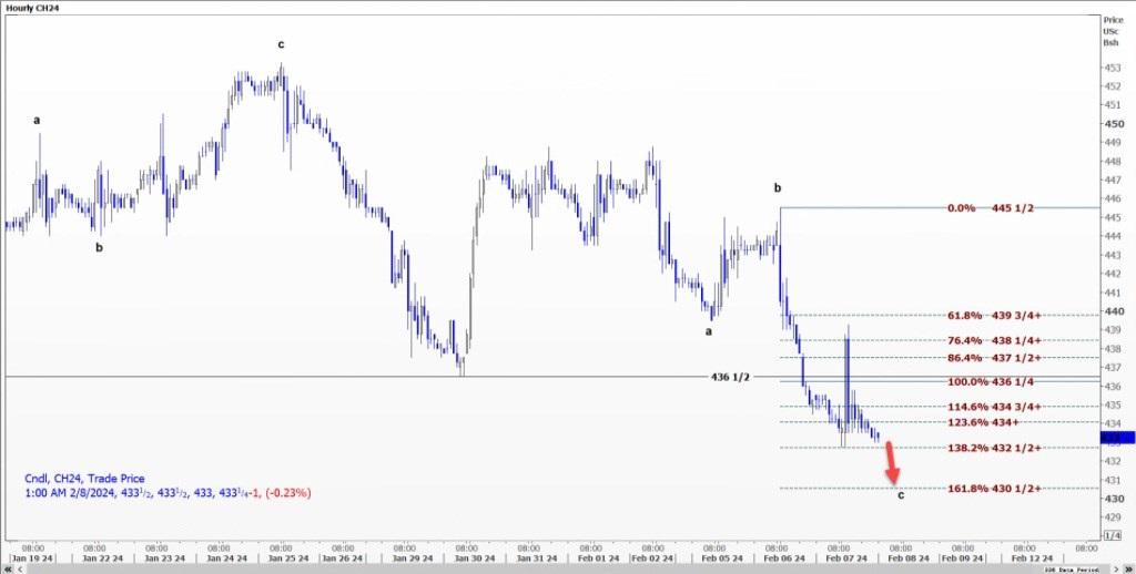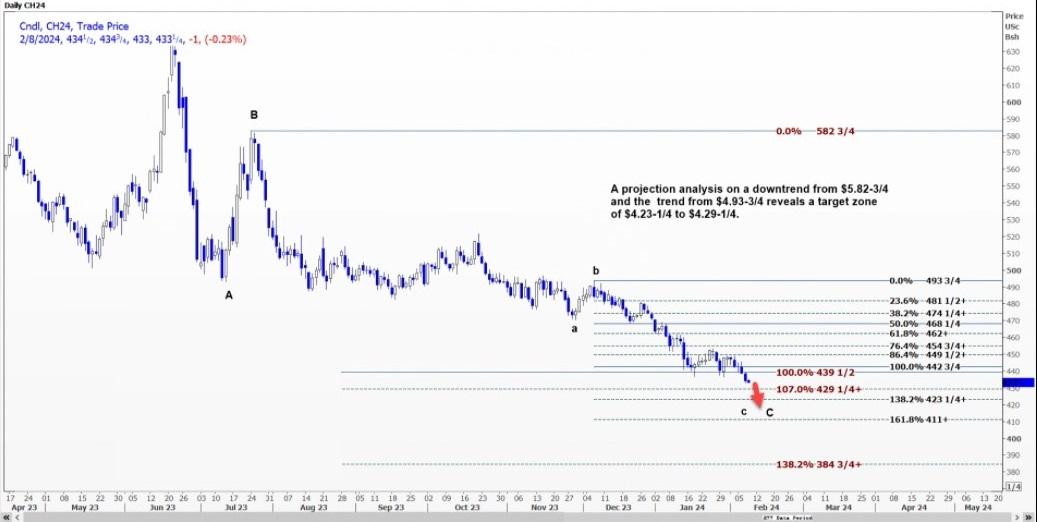 CBOT 3月玉米CH24可能将跌幅扩大至每蒲式耳4.30-50美元,完成从4.45-50美元的c波。