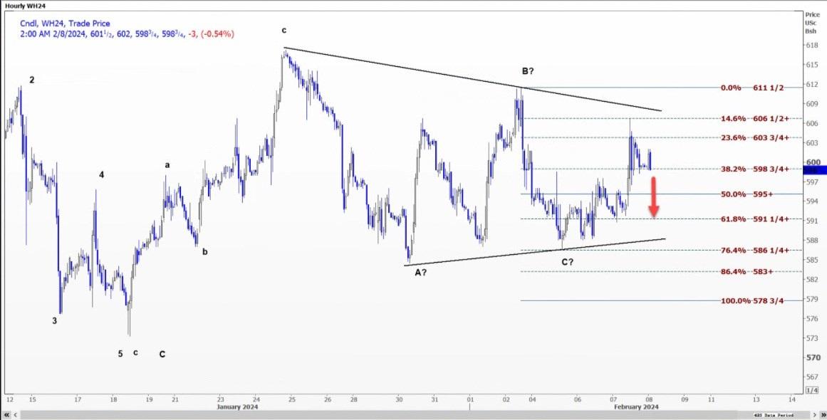 CBOT 3月小麦WH24未能突破6.06-50美元的阻力位,预计将跌至每蒲式耳5.9125美元至5.95美元的区间。
