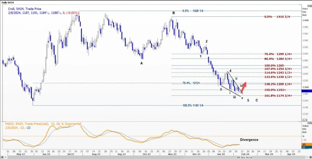 CBOT大豆3月合约SH24可能会重新测试每蒲式耳11.93-50美元的阻力位,正如其波浪形态所示。