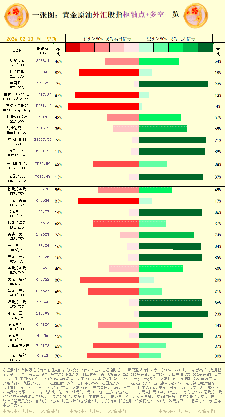 标题:一张图:2024/02/13黄金原油外汇股指"枢纽点+多空占比"一览
