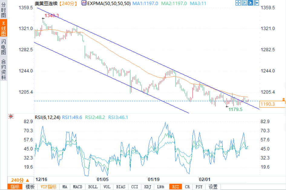 截至北京时间18:15,芝加哥期货交易所(CBOT)美黄豆连续下跌0.15%,至1191.3,略高于上周1179.3美元的低点。