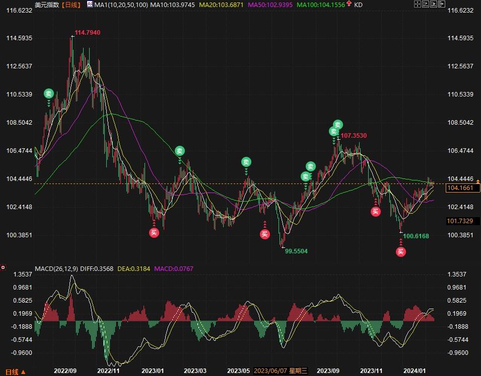50日和200日均线分别为104.004和103.466,强化了看涨情绪,表明该指数在枢轴点上方走强。