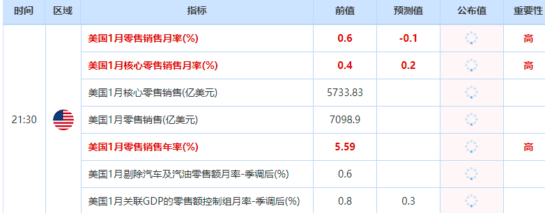 现在的焦点是今晚21:30将公布的美国“恐怖数据”——美国零售销售数据,以及周五(2月16日)公布的生产者物价指数(PPI)数据。本周至少有三位美联储官员将发表讲话。