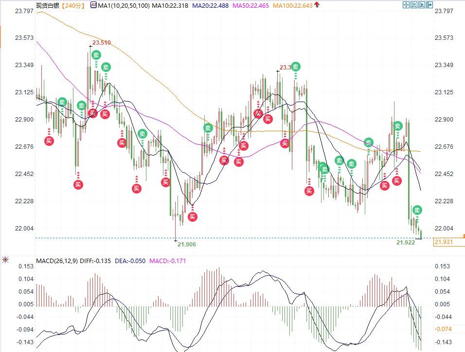 预测今日银价将呈现看空趋势。白银继续下跌的关键条件是保持在22.25美元/盎司下方;若突破此水平,将推动银价尝试恢复,并构建新的看涨走势,目标再次测试23.00美元/盎司。今日银价交投将在支撑位21.50美元/盎司与阻力位22.30美元/盎司之间。