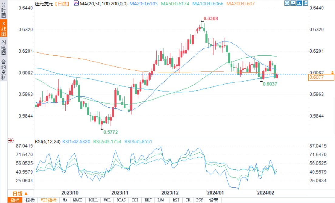 新西兰元兑美元在0.6054美元徘徊,隔夜下跌1.2%,仅略高于近期0.6040 - 0.61美元区间的底部。