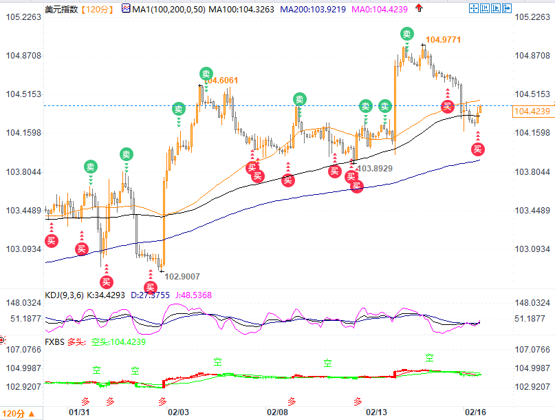 美元指数自2月2日非农引发大涨以来,一直依托2小时图的50均线及100均线震荡上涨,昨日下探刺穿了这两个均线,日内貌似在企图重新夺回,短线上方阻力关注104.60-104.70区域,若突破则上看104.90-104.97区域。下方支撑依次关注104.32-104.22区域,若跌破则打开下探200均线的空间,当前切入位在103.92。