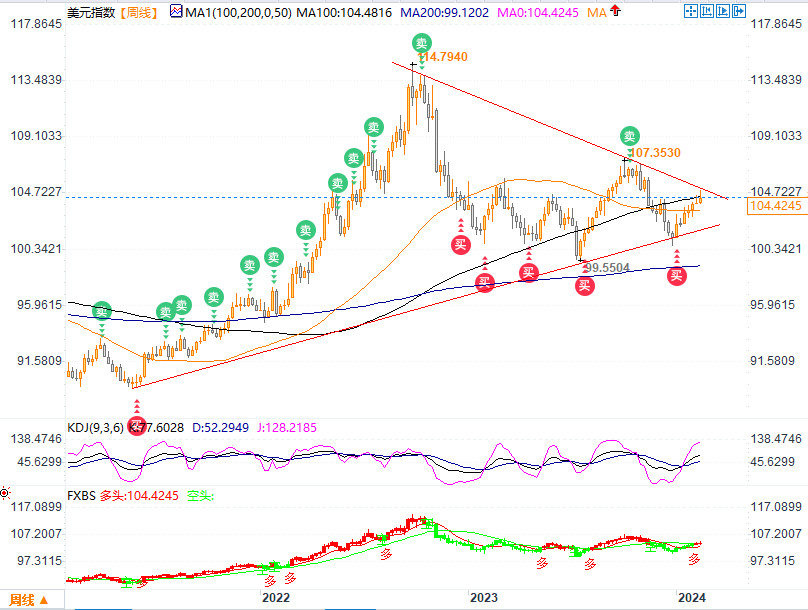 美元指数周图自2022年10月、2023年10月及11月高点连线的当前切入位刚好维护本周高点,表明多头对该上轨压制保存警惕,部分投资者在此处获利了结或出现部分做空操作,因此,在正式突破并回踩确立突破该压制位之前,在该水平附近不宜做多。