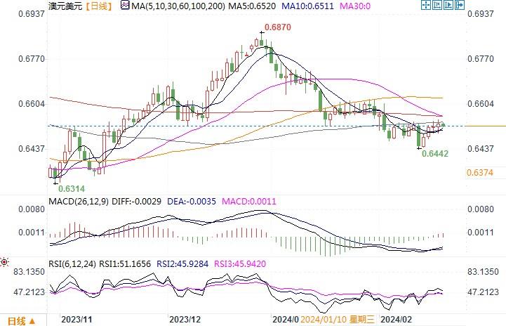 周一(2月19日),澳元兑美元触及两周高点 0.6551 美元。中国股市在结束春节长假后小幅上涨,为澳元带来一些慰藉。展望未来,投资者面临的主要风险是周三的澳洲工资数据。经济学家预计,去年第四季薪资较前季增幅可能从1.3%放缓至0.9%。 如果薪资增长数据呈现下降,势必会增强市场对于澳联储提早降息的预期,从而影响到澳元的走势。投资者需对该项数据情况加以密切注意。技术层面上,5、10和21日移动均线缠绕,21日波林格区间收缩,日线图动能指标攀升,信号表明正在筑底。收盘若高于承压的21日移动均线0.6539,将是看多信号。2月和2024年趋势低点0.6443将是首道重要支撑位。