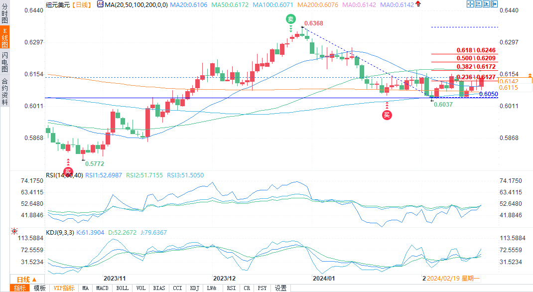 纽元兑美元延续了上周三(2月14日)开始的上涨势头,周一盘中小幅上涨至0.6150,为一周最高水平。