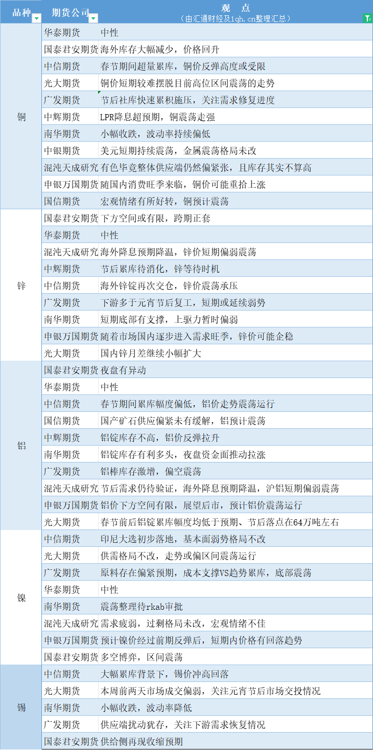 汇通财经APP讯——期货公司观点汇总一张图:2月21日有色系(铜、锌、铝、镍、锡等)