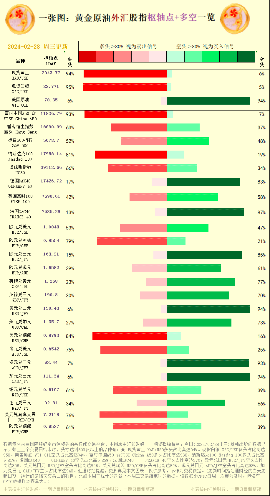 标题:一张图:2024/02/28黄金原油外汇股指"枢纽点+多空占比"一览