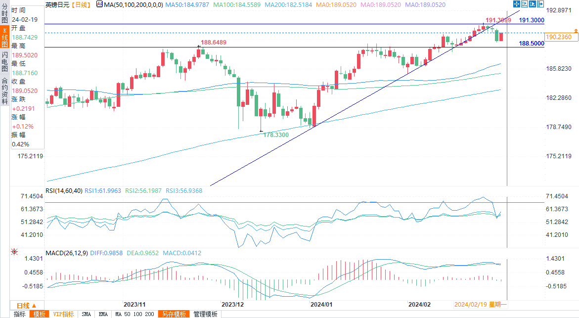 英镑兑日元周五盘中上涨,交投于趋势线支撑位190.20下方,汇率正向另一个关键底部188.50靠近。多头必须守住188.50这条线才能挫败看跌势头;任何未能维持该底部的情况都会增加进一步下跌至50日移动均线186.35的风险。