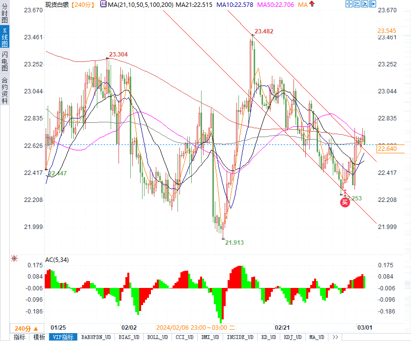 预计今日银价将在支撑位22.50美元/盎司与阻力位23.10美元/盎司之间波动。今日白银价格预期趋势为看涨。