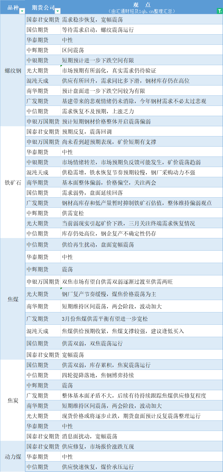 汇通财经APP讯——期货公司观点汇总一张图:3月4日黑色系(螺纹钢、焦煤、焦炭、铁矿石、动力煤等)