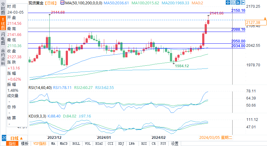 汇通财经APP讯——周二(2月5日)美盘早盘,现货黄金冲高回落。盘中最高触及2141.66美元/盎司,距离去年12月创下的历史最高记录2144.68美元/盎司仅3美元。现价格回落至2127.18美元/盎司,涨幅0.61%。