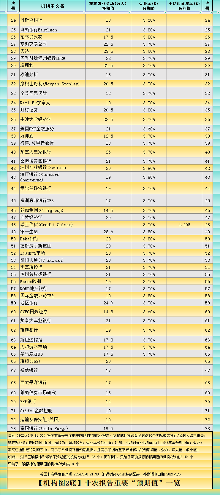 (上图2:投行/金融大咖预测非农报告、非农+失业率+薪资年率,三个中预测两个或一个)