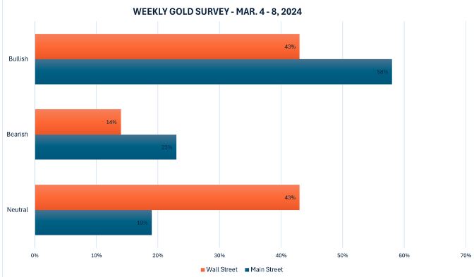 Kitco News最新的每周黄金调查显示,本周的看涨情绪已在华尔街和大街上完全占据主导地位,两个阵营中的绝大多数受访者都认为金价下周将上涨或横盘整理。