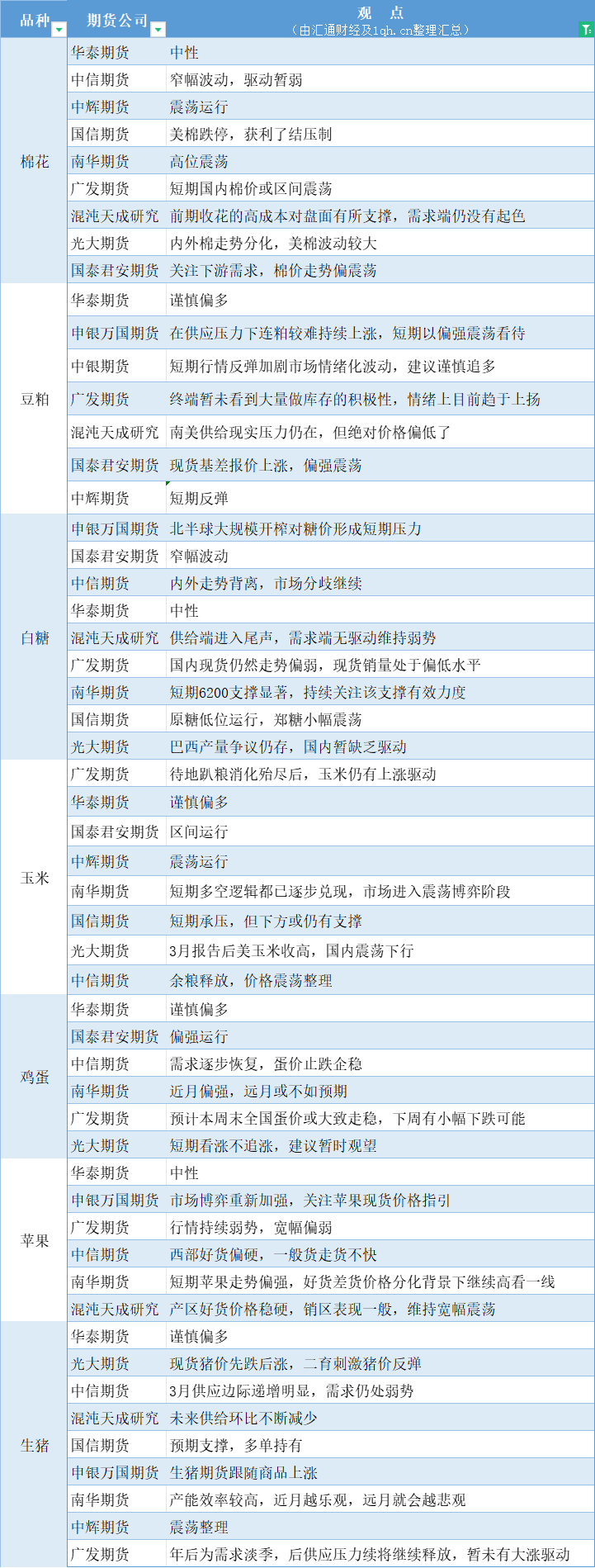汇通财经APP讯——期货公司观点汇总一张图:3月11日农产品(棉花、豆粕、白糖、玉米、鸡蛋、生猪等)