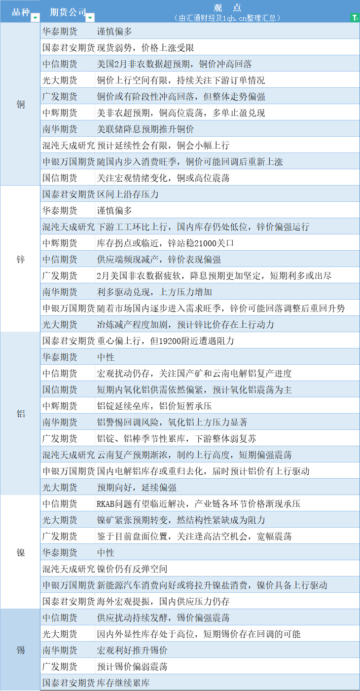 汇通财经APP讯——期货公司观点汇总一张图:3月11日有色系(铜、锌、铝、镍、锡等)