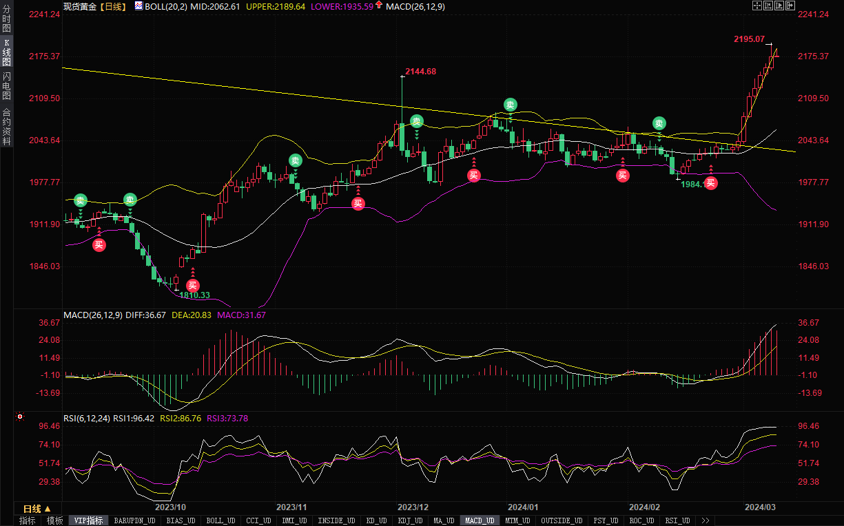 现货黄金上周五收盘大涨19.38美元,涨幅0.9%,收报2178.95美元/盎司,金价盘中最高触及2195.07美元/盎司。