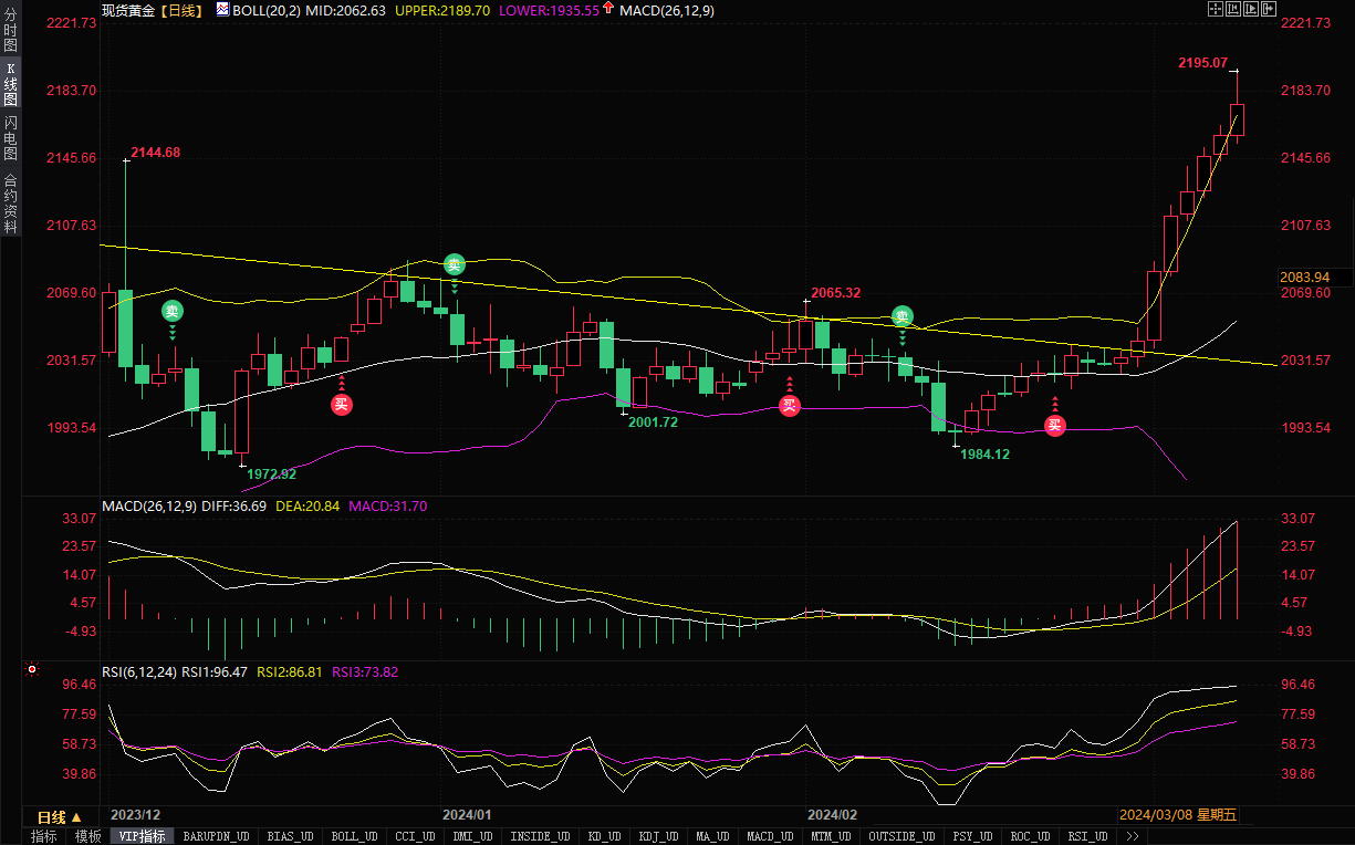 汇通财经APP讯——现货黄金上周五(3月8日)再次刷新历史高点至2195.07美元/盎司,因美国失业率上升的数据提振了对美联储可能很快开始降息的预期。上周五现货黄金收报2178.58美元/盎司,日线录得八连阳,周线涨幅约4.57%,创下自10月中旬以来的最大周线涨幅,也是连续第三周上涨。分析师认为,将金价目标设定为2300美元/盎司在年底前看起来更有希望实现。