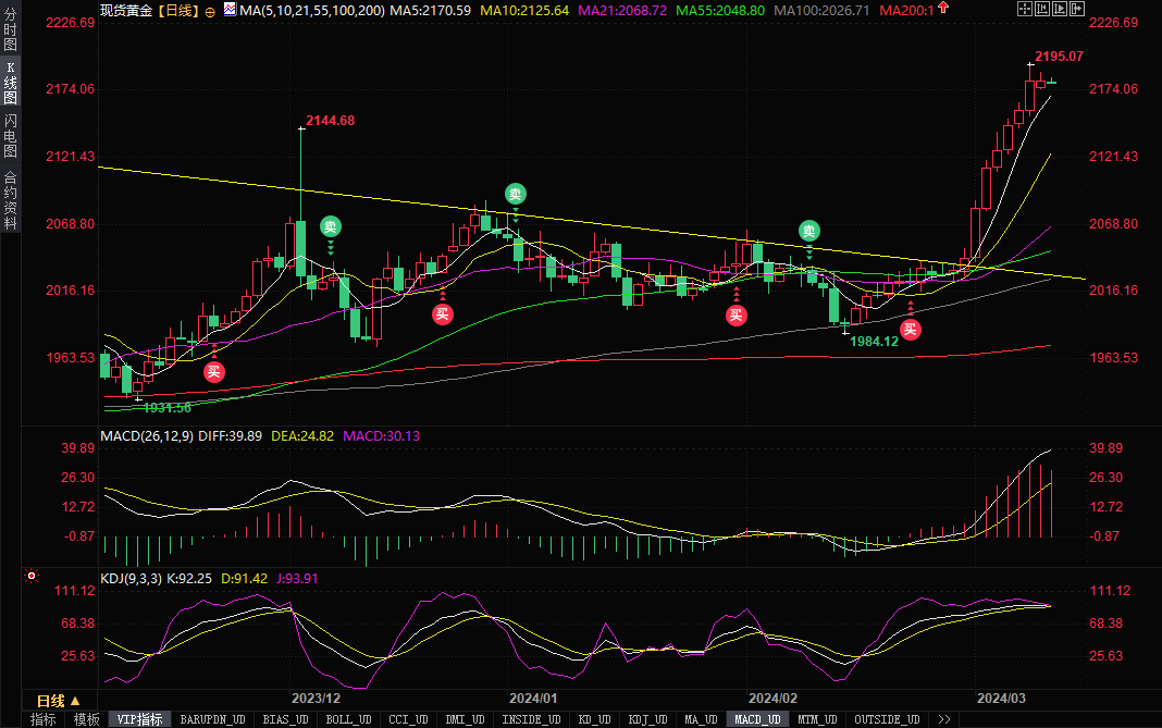 黄金多头周一稍作喘息,在窄幅区间内盘整,略低于历史新高(2195美元/盎司)和2200美元/盎司心理关口。