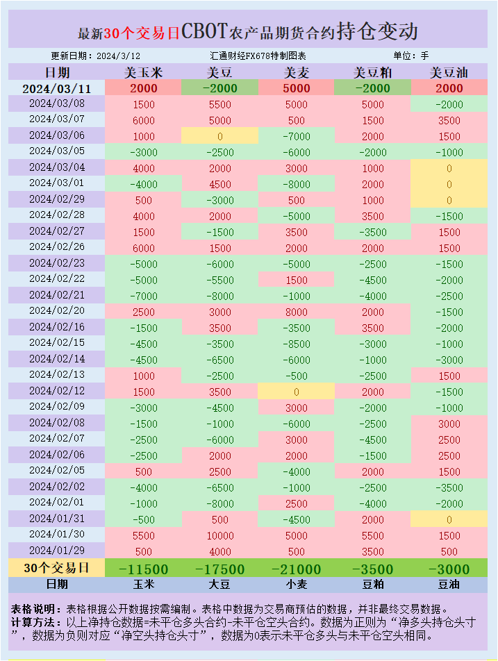 根据汇通财经观察,海外交易商估算的结果显示,本周一(3月11日),大宗商品基金增加CBOT美豆、美豆油、美小麦投机性净多头头寸,增加美豆粕、美玉米投机性净空头头寸。最新30个交易日,大宗商品基金增加CBOT美豆粕、美豆、美玉米、美麦、美豆油投机性净空头头寸。