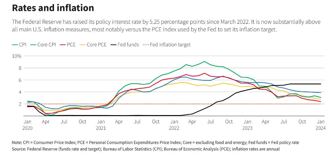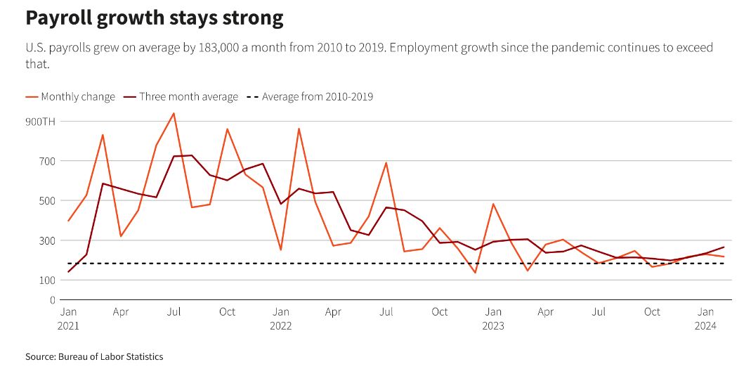 投资者对于是否能够实现低通胀和低失业率的“软着陆”犹豫不决,也看到了6月开始降息的迹象,并将在美联储于3月19日至20日举行会议时寻找这方面的信号。自去年7月以来,政策利率一直保持在5.25%至5.5%的范围内,这是在最后一次加息和按照先前的货币政策周期的降息之间的持有期。