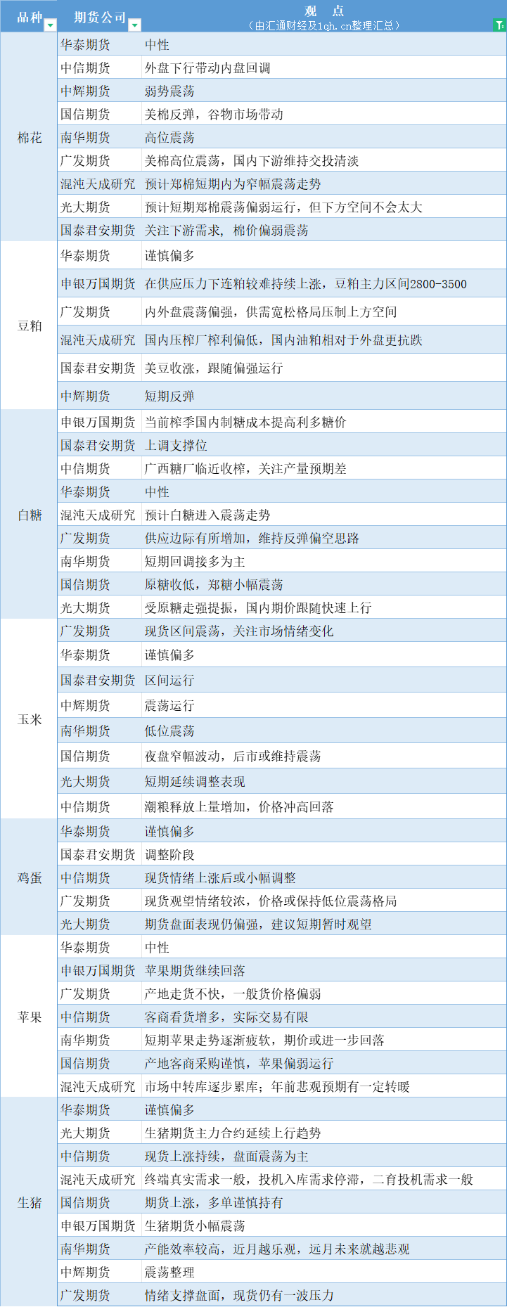 汇通财经APP讯——期货公司观点汇总一张图:3月13日农产品(棉花、豆粕、白糖、玉米、鸡蛋、生猪等)