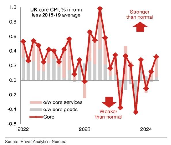 英国央行要想实现将通胀率控制在2.0%左右的目标,核心通胀必须进一步下降。要想降低核心通胀,服务业通胀必须下降。野村证券的下图很有启发意义,因为它显示核心通胀的势头正在再次回升。