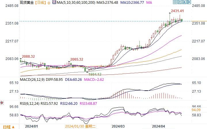 周五稍早,伊朗一座城市上空回荡着爆炸声,消息人士称这是以色列发动的袭击,这是两个宿敌之间最新一次针锋相对的交火,双方数十年的暗战似乎走向公开化,有可能将该地区拖入更深的冲突之中。但德黑兰淡化了这一事件,并表示没有报复计划。伊朗方面的反应,似乎也显示伊以双方也是极力想避免事态的进一步恶化。而一旦地缘冲突行势有缓,那么投资者的目光最终还是要回归到经济发展层面上。这对短期内的黄金来说恐怕不是一个利好因素。因为,近期美国接二连三地公布强于预期的经济增长以及粘性十足的通胀数据,已经使利率期货市场对于美联储6月份降息预期基本为零,降息时点预期也是大大延后,甚至还有大型机构预期美联储存在着恢复升息的可能性。在五月美联储议息会议前,本周美国将有第一季度GDP和3月份个人消费支出(PCE)物价指数等重磅数据登场。如果数据一如前几周所公布的数据一般,显示美国经济增长强劲、通胀高踞不下,势必进一步降低美联储将在年内降息的预期和概率。那么在高息撑持下的美元将有极大机会继续保持强势,而黄金则恐怕要陷入调整回落的风险。
