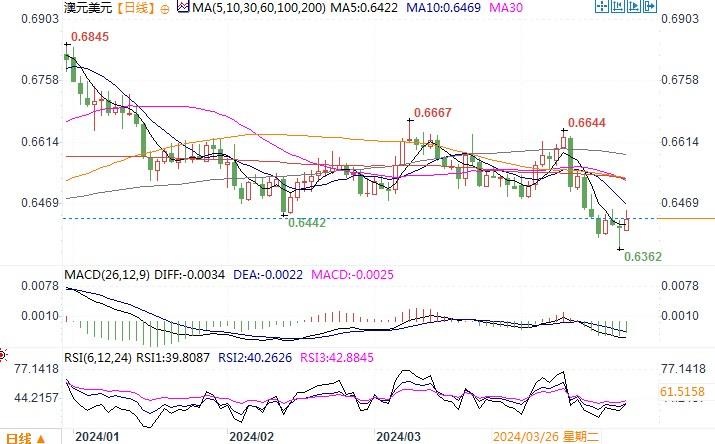 周五(4月19日),澳元跌0.7%至0.6376美元,为11月以来最低,距离0.6340美元的主要支撑位仅一步之遥。因媒体报导称以色列袭击伊朗,刺激了对美元和本地公债的避险需求。市场将非常担心,这是一场以针锋相对的升级的开始,可能会在中东地区造成巨大动荡。在避险需求的推动下,风险偏好情绪低落,商品货币澳元自然成为首当其中遭受抛售的货币之一。况且近期美国经济数据强劲、降息时点预期一直延后,令美元保持强势,也是持续给到澳元压力。日线图上,澳元/美元继续挣扎在近期的低位区域,下方上周低点0.6360若失守,澳元将进一步朝低位下滑。上方只有重新回到0.6480之上,或许才有望摆脱当前不断下滑的势头。