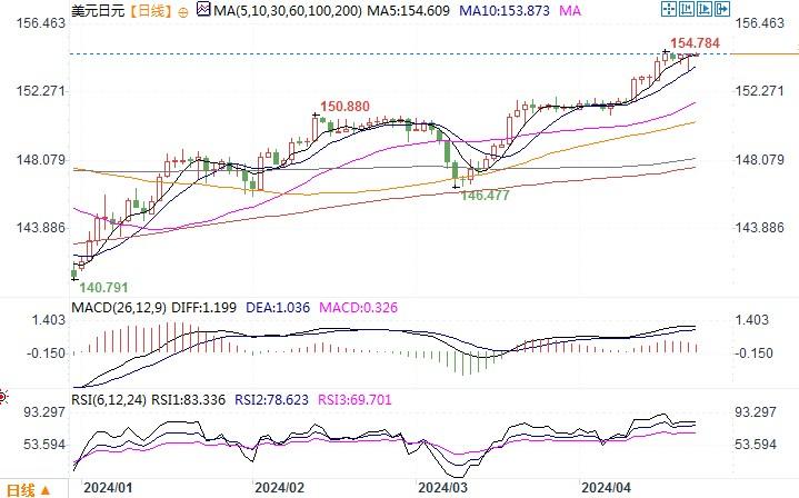 周五(4月19日),美元兑日元纽约尾盘小幅下跌收盘报154.57。虽然伊以冲突纷纷扰扰,给到避险货币瑞郎、日元一些支撑,但过去几周的大主题是美国经济强劲带动美元急升。火热的数据,尤其是上周显示3月通胀率升至3.5%的数据,使得交易员们迅速将他们对美联储今年降息的押注下调,认为最有可能从9月开始降息。这导致美债收益率急升,推动美元指数在上周早些时候升至11月以来的最高。投资者仍主要关注美联储,而不是地缘政治。日本央行总裁植田和男周四表示,如果日元下跌大幅推高通胀,央行可能会再次加息,这凸显了汇率变动可能对下一次政策转变的时机产生影响。日本央行将于下周召开货币政策会议,这可能会引起投资者们一定的注意。周五的数据显示,日本3月核心通胀率从2.8%放缓至2.6%,但仍高于央行2%的目标。数据也有可能增加日本央行继续加息的砝码。于此同时,日本财务大臣铃木俊一周五向投机客发出了新的警告。他表示,当局将采取适当行动应对外汇市场过度波动的情况,并再次警告投资者不要过度压低日元。日本当局的上述一些消息,虽然对日元近期的颓势未产生太大的扭转作用,但投资者们还是要打醒精神,随时防范日本当局干预所带来的短线美元/日元下调风险。继续留意上方的警戒水平155,若冲不过去,则小心调整性回落风险。