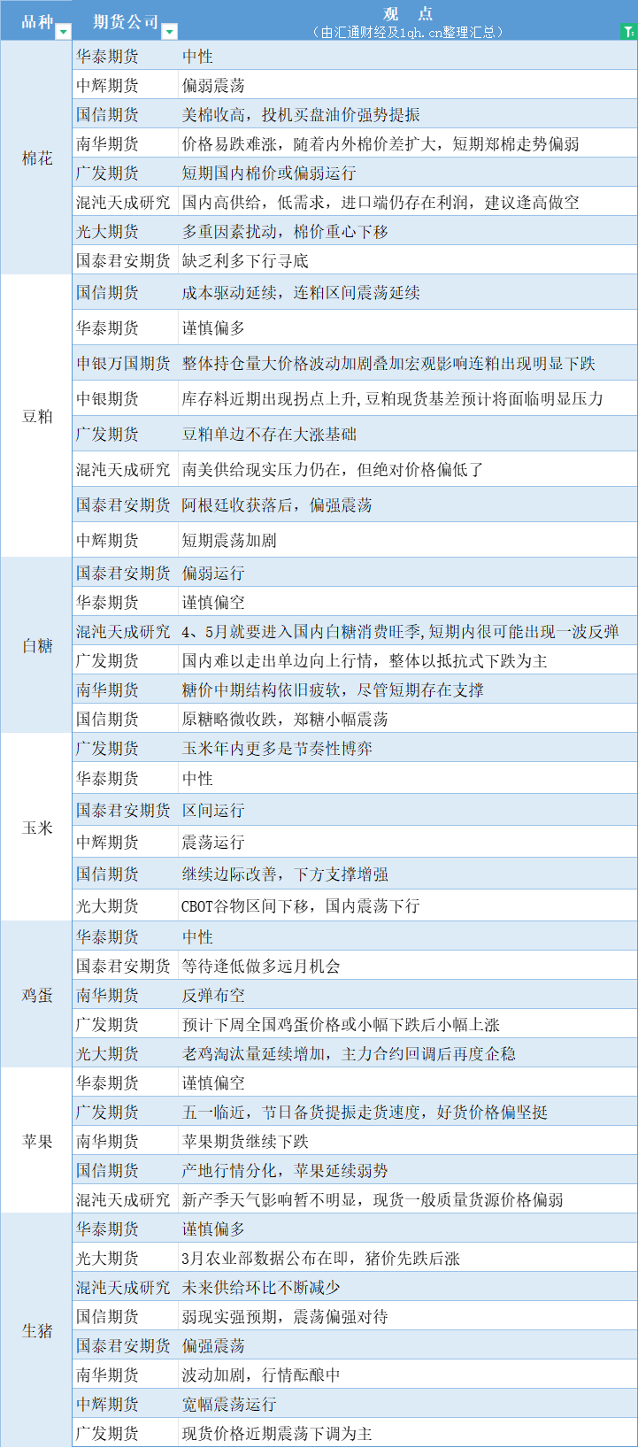 汇通财经APP讯——期货公司观点汇总一张图:4月22日农产品(棉花、豆粕、白糖、玉米、鸡蛋、生猪等)