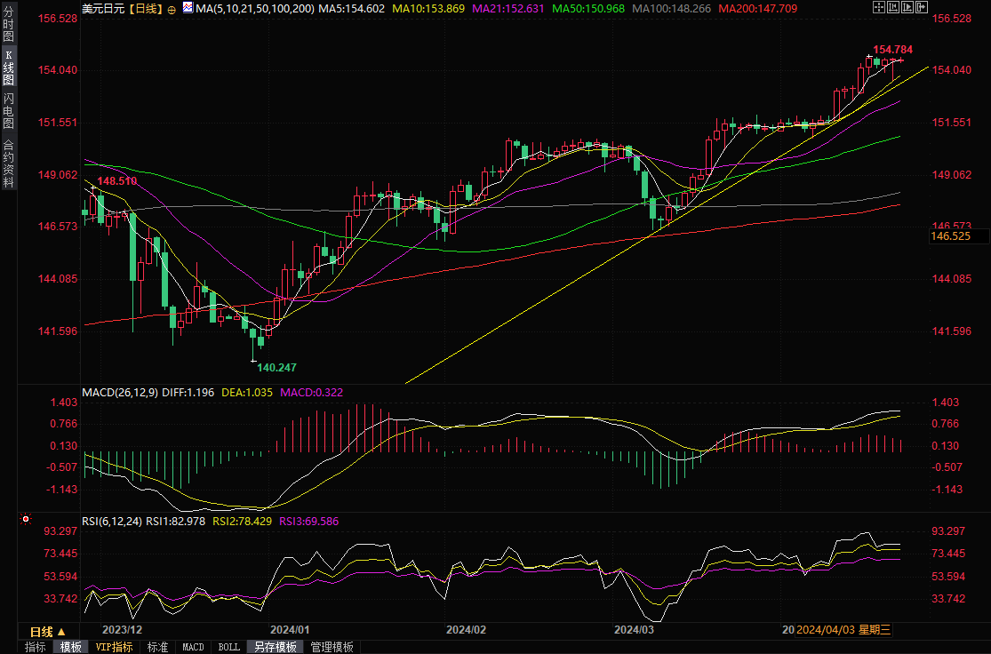 在技术分析方面,据FXEmpire分析师Bob Mason表示,美元/日元仍远高于50日和200日均线,表明存在看涨信号。如果美元/日元突破4月16日的高点154.787,可能会推动多头市场冲破155关口。相反,如果美元/日元跌破153.5关口,可能会引发151.685的支撑位发挥作用。14天RSI为74.80,显示美元/日元处于超买区域,而在4月16日的高点154.787处可能会增加抛售压力。