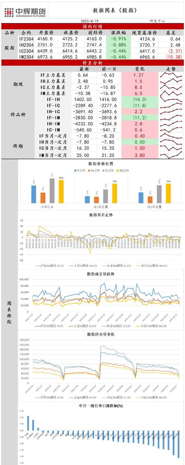 中辉期货股指日报20230419:市场情绪退潮,股指横盘整理