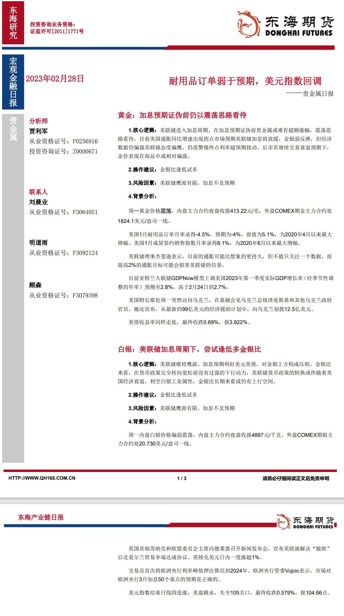 汇通财经APP讯——贵金属:隔夜贵金属小幅走高,美国1月耐用品订单月率录得-4.5%,前值为5.1%,为2020年4月以来最大降幅。美国1月成屋签约销售指数月率录得8.1%,为 2020年6月以来最大...