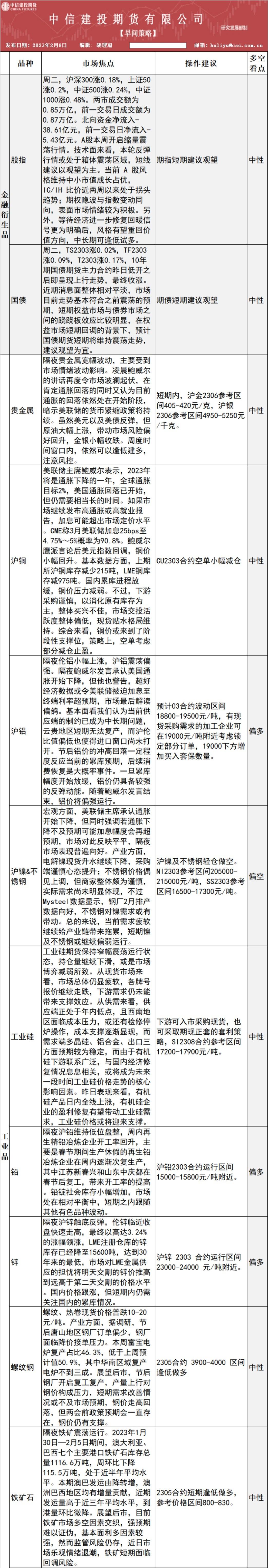 中信建投期货2月8日早间交易策略