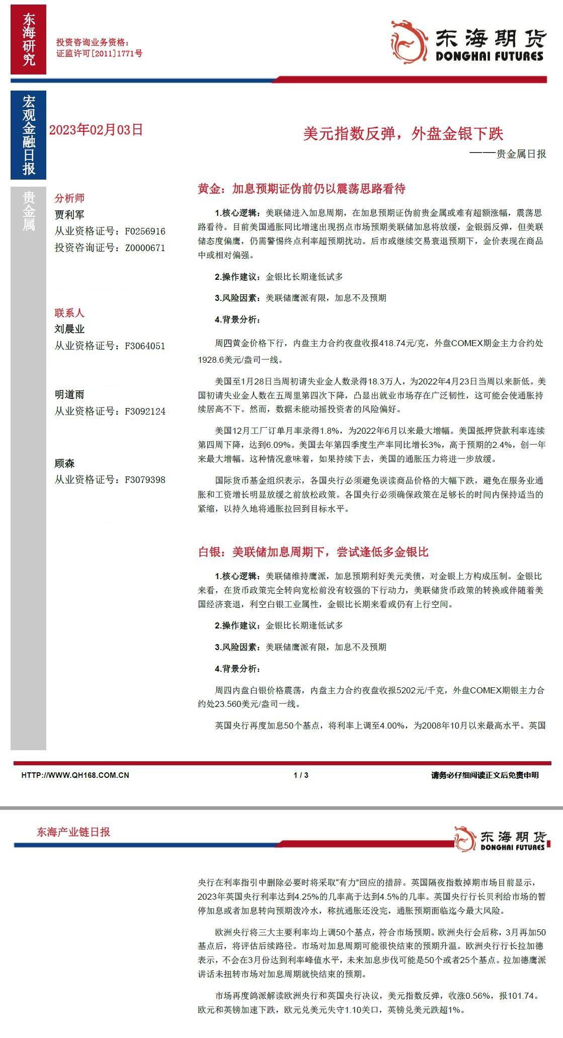 汇通财经APP讯——黄金:加息预期证伪前仍以震荡思路看待。白银:美联储加息周期下,尝试逢低多金银比。东海期货公司授权文本由“专注期货开户交易及专业行情分析资讯网站”:【一期货 www.1qh.cn】转...
