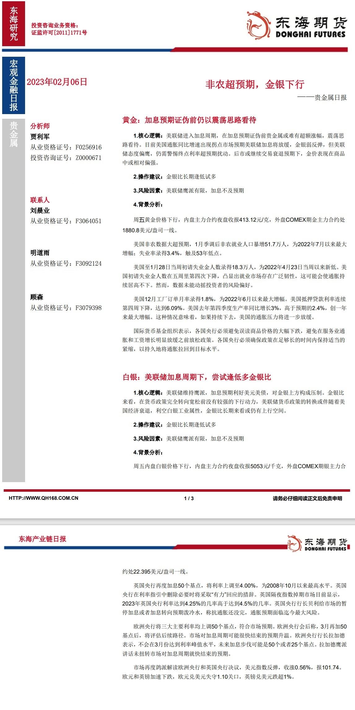 【东海期货2月6日产业链日报】贵金属篇:非农超预期,金银下行