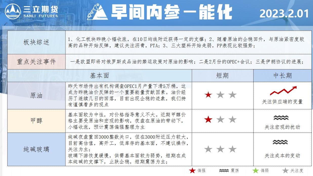汇通财经APP讯——三立期货早间内参显示,原油短线偏向多头,中长线偏向多头,关注供应端的变量。甲醇短线偏向多头,中长线偏向震荡,关注宏观的扰动;纯碱玻璃短线偏向震荡,中长线偏向震荡,关注成本的变动。三...