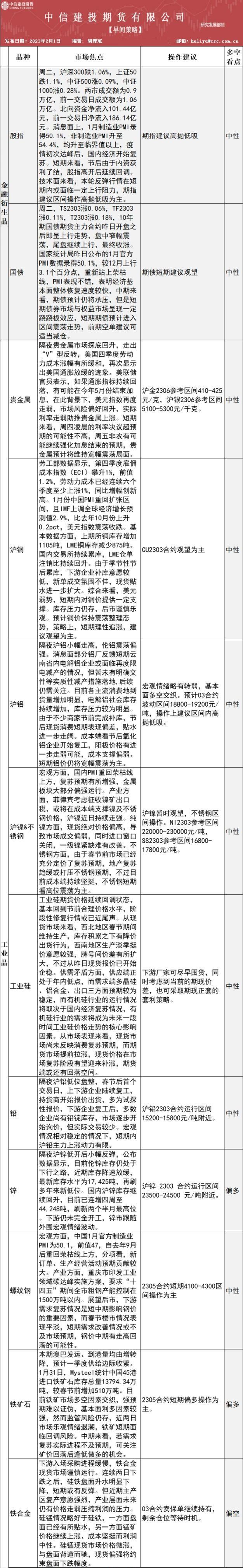 中信建投期货2月1日早间交易策略